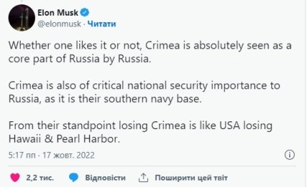 Подобається це комусь чи ні, але Крим абсолютно точно розглядається Росією як невід'ємна частина Росії. Крим також має критичне значення для національної безпеки Росії, оскільки він є її південною військово-морською базою. З їх точки зору, втрата Криму - це все одно, що для США втрата Гавайських островів і Перл-Харбору… Росія "бачить" Крим як важливу частину Росії, так само, як Америка вважає важливою частиною Америки Гаваї, - написав Ілон Маск.