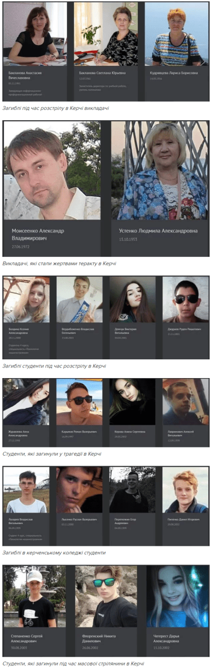 У мережі були опубліковані фото усіх жертв масового вбивства в окупованій Керчі, яких 17 жовтня в політехнічному коледжі розстріляв студент Владислав Росляков. Знімки всіх загиблих оприлюднило видання "КП".
