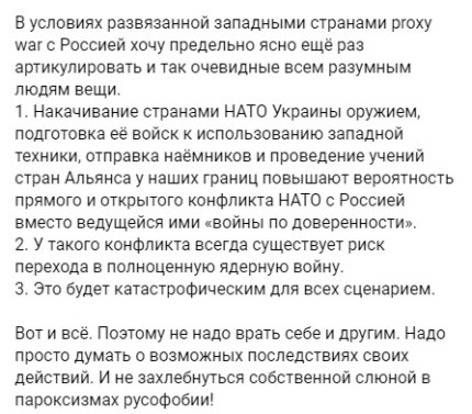 Накачування країнами НАТО України зброєю, підготовка її військ до використання західної техніки, відправлення найманців та проведення навчань країн Альянсу біля наших кордонів підвищують ймовірність прямого та відкритого конфлікту НАТО з Росією.