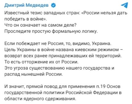 Відома теза західних країн: "Росії не можна дати перемогти у війні". Що вона означає насправді?Простежте просту формальну логіку. Якщо перемагає не Росія, то, мабуть, Україна. Мета України у війні названа київським режимом - повернення всіх територій, що раніше належали їй. Тобто відторгнення їх від Росії. Це загроза існуванню нашої держави і розпад нинішньої Росії, - йдеться в повідомленні Медведєва.