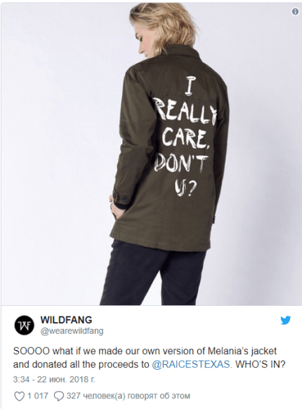 "У соцмережах почали демонструвати, як повинна була б виглядати куртка Меланії Трамп під час її візиту до мігрантів. Так, дизайнер та ілюстратор Джастін Теодоро опублікував у Мережі скетч куртки з написом "Нікому не повинно бути байдуже". А ілюстратор Хуана Медіна, яка є колишньою іммігранткою, порівняла куртку Меланії з висловлюванням, що нібито належить Марії Антуанетті: "Якщо у них немає хліба, нехай їдять тістечка!", - сказано в повідомленні.