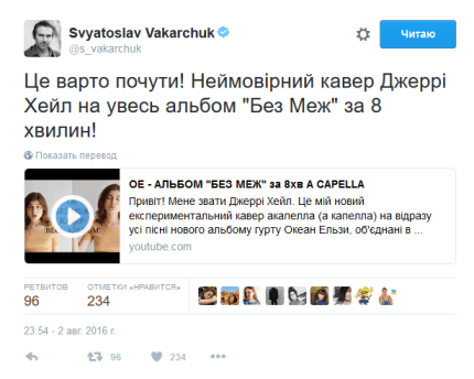"Це варто послухати! Неймовірний кавер Джеррі Хейл на весь альбом "Без меж" за 8 хвилин!", - написав у своєму Twitter-акаунті лідер "океанів".