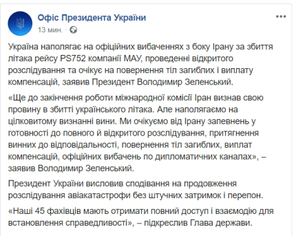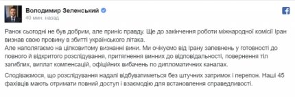"Ранок сьогодні не був добрим, але приніс правду. Ще до закінчення роботи міжнародної комісії Іран визнав свою провину в збитті українського літака. Але наполягаємо на цілковитому визнанні вини. Ми очікуємо від Ірану запевнень у готовності до повного й відкритого розслідування, притягнення винних до відповідальності, повернення тіл загиблих, виплат компенсацій, офіційних вибачень по дипломатичних каналах", - заявив Зеленський.