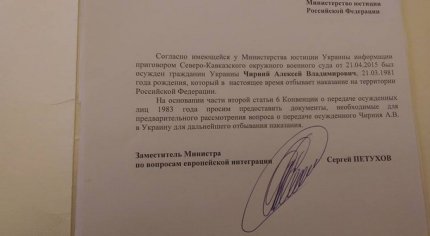"Підписав запит до Росії про передачу незаконно засудженого там Олексія Чирнія відповідно до поданої ним заяви", - написав Пєтухов.