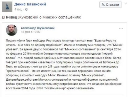 "Після загибелі Гіві мій друг Ростислав Антонов написав мені: "Якщо зараз не почати - вони всіх по одному повбивають". Саме тому ми говоримо, що "Мінськ вбиває". За час двох з половиною років "Мінських угод" загинуло більшість ополченців і командирів "першої хвилі" - тобто людей найбільш ідейних, мотивованих і загартованих у боях", - написав Жучковський.