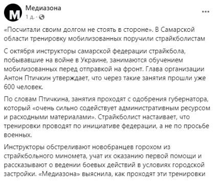Як вдалося дізнатися російський опозиційним журналістам, у Самарській області Росії бойову підготовку мобілізованих делегували місцевій федерації страйкболу.