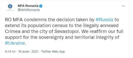 Міністерство закордонних справ Румунії засуджує перепис населення українського півострова, який проводить окупаційна влада Російської Федерації в Криму. Про це йдеться в заяві відомства.