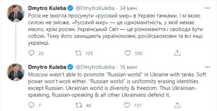 "Росія не змогла просунути "русский мир" в Україні танками. І м’якою силою не зможе. «Русский мир» – це одноманітність, у якій немає нікого, крім росіян. Український Світ – це різноманіття і свобода бути собою. Тому його захищають україномовні, російськомовні та всі інші українці", – наголосив у своїй заяві Дмитро Кулеба.