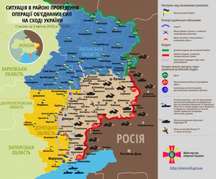 В Міноборони наголошують, що протягом 2 квітня російські війська утрималися від обстрілів на Луганському напрямку. Однак на Донецькому здійснили 11 обстрілів, більше половини з яких — із застосуванням заборонених Мінськими домовленостями мінометів калібру 120 мм та 82 мм. Окрім того, ворог також активно використовував гранатомети, кулемети та стрілецьку зброю.