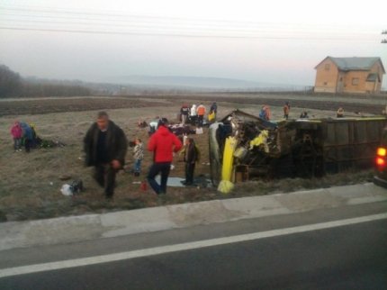 Як повідомили в поліції, в результаті зіткнення автобус "Мінськ - Буковель" з'їхав в кювет і перекинувся. У момент зіткнення в автобусі перебували 42 пасажири і 2 водії.