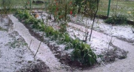 Жителі селища стверджують, що сніг йшов близько півгодини і пройшов відразу після граду, який за десять хвилин встиг знищити частину посівів та врожаю.