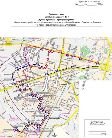 9. автобусів маршруту № 2 «Вулиця Булгакова – вулиця Шолуденка» в напрямку вул. Шолуденка трасі: від вул. Булгакова до б-ру Вацлава Гавела за власним маршрутом, далі – вул. Миколи Василенка вул. Перемоги до вул. Гарматної, далі за власним маршрутом.