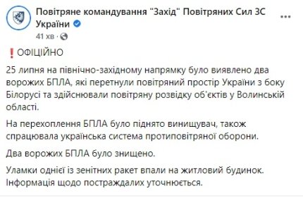 Окрім того, командування "Захід" Повітряних сил заявило, що 25 липня на північно-західному напрямку було виявлено два ворожих БПЛА, які перетнули повітряний простір України з боку Білорусі та здійснювали повітряну розвідку об'єктів на Волині.