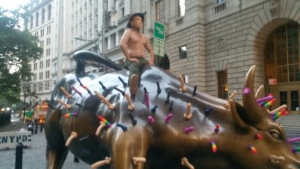 У центрі Нью-Йорка невідомі провели красномовну акцію після переговорів Путіна і Трампа в Гельсінкі. Вони посадили манекен "напівголого Путіна" на скульптуру Артуро Ді Модіка "Атакуючий бик", яку прикрасили десятками різнокольорових фалоімітаторів.
