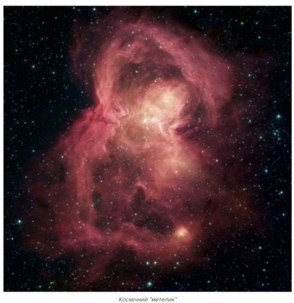 Космічний "метелик" - це гігантська структура, яка зовні схожа на метелика, являє собою туманність – колосальну хмару з газу і пилу,. "Крила" дивовижного космічного метелика – це бульбашки розжареного міжзоряного газу, що виходить від найгарячіших і найбільш масивних світил в даному регіоні.