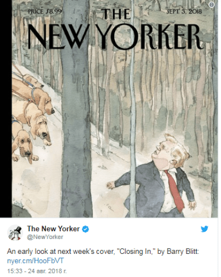 Авторитетний американський журнал The New Yorker присвятив нову скандальну обкладинку президенту США Дональда Трампа. На ній американський глава тікає від зграї собак, повідомляє ONLINE.UA.