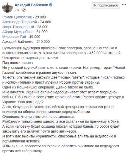 Бабченко підкреслив, що сумарна аудиторія заблокованих блогерів становить понад 450 тисяч передплатників. А блокують їх, на думку журналіста, через російських ботів, які масово відправляють скарги адміністрації соцмережі.