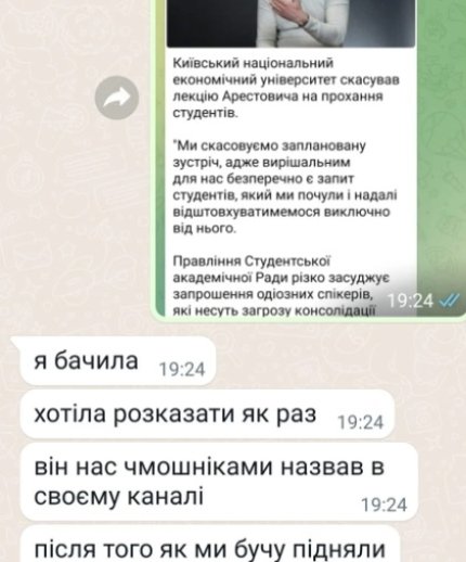 Вона опублікувала скриншоти листування з дочкою, де та розповідає, що студенти вчинили бунт, а ініціатор ідеї — голова Студентської академічної ради подав у відставку та перепросив. Ймовірно, йдеться про Миколу Кожеченкова, студента 3-го курсу факультету Міжнародної Економіки й менеджменту КНЕУ.