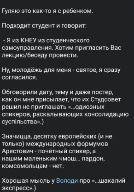 Значить в десятці європейських (та не лише) міжнародних форумах Арестович — поважний спікер, а нашим маленьким чмош…пардон комсомольцям — ні, — написав Арестович.