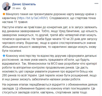 Шмигаль наголосив, що він доручив кожному міністерству і відомству сформувати детальні роз'яснення, за яких умов повинні працювати об'єкти, які будуть відкриватися. Так, Мінекономіки і МОЗ вже розробили чіткі критерії роботи і алгоритми контролю продовольчих ринків. Це, за словами Шмигаль, дасть можливість вже в середу, 29 квітня, прийняти рішення про відкриття більш ніж 280 ринків по всій Україні.