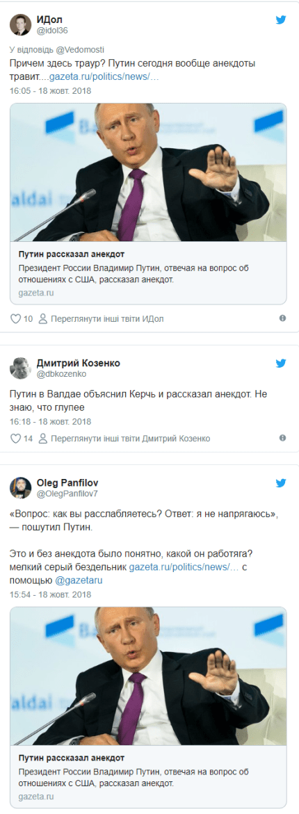 "Анекдот вирішив розповісти? Він серйозно?; в Керчі траур, а йому смішно; те, що він не напружується - давно уже всім зрозуміло; це ж потрібно було до такого додуматися; і ця людина - президент РФ!", - обурюються користувачі соцмереж в коментарях до відео.