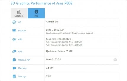 Судячи з даних GFXBench, новинка наділена 7,9-дюймовим сенсорним дисплеєм з роздільною здатністю 2048 × 1536 пікселів. У фронтальній частині встановлена 2-мегапіксельна камера, ззаду - 8-мегапіксельна.