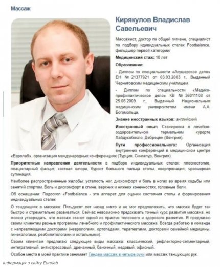 Влад Кірякулов, якому Володимир Зеленський довірив збір крові, наразі справді працює у цьому медичному центрі, але масажистом. Інформація про це є на офіційному сайті.