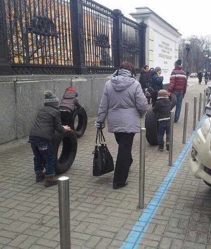 "Непереможні. Фото, від яких хочеться плакати. 18 лютого 2014-го, на Інститутській люди самі вишикувалися у живий ланцюг і передають чоловікам на передову булижники. 19 лютого 2014-го. Незважаючи на всі смерті напередодні, сім'я йде на Майдан з новими шинами", - пише Бутусов, опублікувавши два знаменитих знімка.