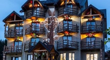 Готель виконаний з дерева та каменю, і зовні дуже нагадує казковий замок. Чарівну атмосферу також додає форма вікон і кам'яний паркан.
