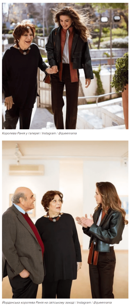 Королева Йорданії Ранія аль-Абдалла знову здивувала шанувальників вибором образу для світського заходу. Її Величність прибула на виставку картин у шкіряній куртці. Таке стильне рішення шокувало багатьох присутніх, передає ONLINE.UA.