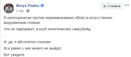 Міський голова Дніпра Борис Філатов виступив проти перейменування Дніпропетровської області у Січеславську. На своїй Facebook-сторінці він написав, що категорично проти перейменування області штучно вигаданим словом.
