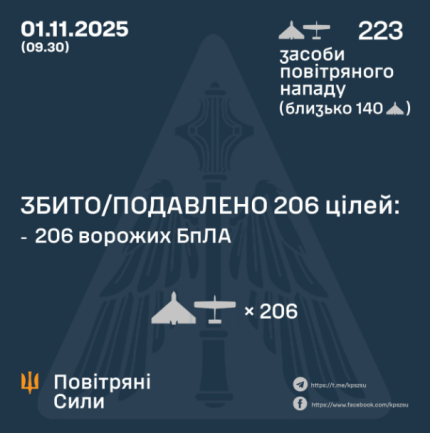 Як повідомляють Повітряні сили ЗСУ, протягом ночі 31 жовтня та 1листопада російські окупанти здійснювали атаку на мирні українська міста та села 223 ударними БпЛА типу Shahed, Гербера і безпілотниками інших типів. Сили ППО змогли успішно знешкодити більшість ворожих цілей.