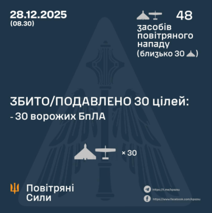За попередніми даними, станом на 08:30, протиповітряною обороною збито/подавлено 30 ворожих БпЛА типу Shahed, Гербера і дрони інших типів на півночі, півдні та сході країни.