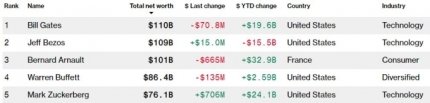 У п'ятірку найбагатших входять французький бізнесмен Бернар Арно зі 103 мільярдами доларів, інвестор Воррен Баффетт з 86,6 мільярда. Традиційно замикає її очільник Facebook Марк Цукерберг, який володіє активами у 74,5 мільярда доларів.