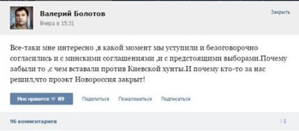 «Все-таки мені цікаво, в який момент ми поступилися і беззастережно погодилися з Мінською угодою і з майбутніми виборами (на Донбасі - Ред.). І чому хтось за нас вирішив, що проект «Новоросія» закритий!» - дивується він.