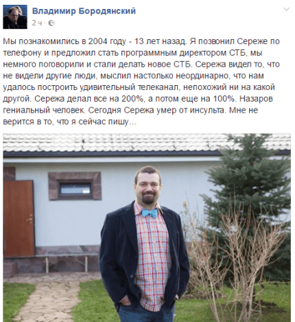 "Сергій бачив те, що не бачили інші люди, мислив настільки неординарно, що нам вдалося побудувати дивовижний телеканал, несхожий на жоден інший. Сергій робив все на 200%, а потім ще на 100%. Назаров геніальна людина. Сьогодні Сергій помер від інсульту", - написав Бородянський.