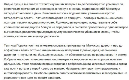 "А ви знаєте статистику наших втрат у вигляді безповоротно убывших з різних причин з воюючих, в першу чергу, підрозділів? Щонайменше п'ятдесят людей на день. Увімкніть мізки і підрахуйте...За місяць півтори тисячі з двох корпусів. Я думаю, ви приблизно уявляєте собі кількість бійців на передовій, і зможете провести ще одне нехитре обчислення, розділивши приблизну суму на кількість убывших в місяць, щоб зрозуміти, скільки ми ще протримаємося", - поскаржився Ходаковський.