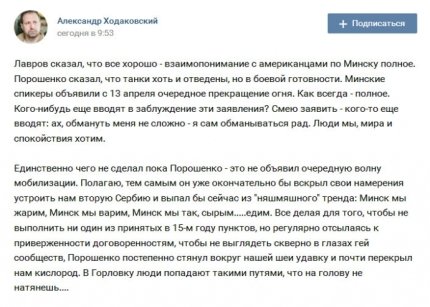 "Лавров сказав, що все добре взаєморозуміння з американцями по Мінську повне. Порошенко сказав, що танки хоч і відведені, але в бойовій готовності. Мінські спікери оголосили з 13 квітня чергове припинення вогню. Як завжди - повне. Кого-небудь ще вводять в оману ці заяви?", - написав він.