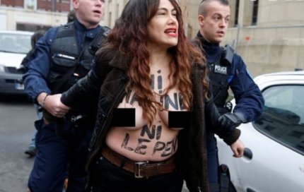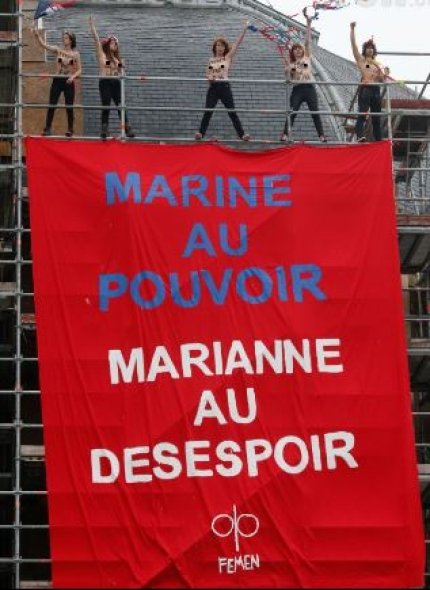 Так, п'ятеро оголених до поясу жінок розвісили великий банер біля церкви в Енен-Бомоні в знак протесту обрання Марін Ле Пен главою держави.