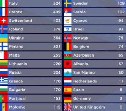 12 - Ізраїль, Франція, Італія, Польща, Литва10 - Австралія, Бельгія, Португалія, Фінляндія, Молдова, Чехія8 - Ірландія, Азербайджан, Сербія, Хорватія, Ісландія7 - Словенія, Австрія, Росія, Румунія6 - Іспанія, Грузія, Латвія, Кіпр, Болгарія5 - Норвегія, Нідерланди, Сан-Марино, Греція, Естонія4 - Німеччина, Великобританія, Албанія, Швеція, Північна Македонія2 - Швейцарія1 - Данія, Мальта.