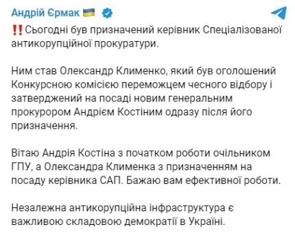 Сьогодні був призначений керівник Спеціалізованої антикорупційної прокуратури. Ним став Олександр Клименко, який був оголошений Конкурсною комісією переможцем чесного відбору і затверджений на посаді новим генеральним прокурором Андрієм Костіним одразу після його призначення,- офіційно повідомив Андрій Єрмак.