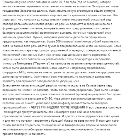 Він також детально розповів, як люди Захарченко вкрали понад 500 мільйонів російських рублів з осередків в одному із захоплених банків Донецька. При цьому винними, за словами Пургина, призначили деяких стрілочників, яких посадили в підвал і тепер збираються засудити до довічного ув'язнення.