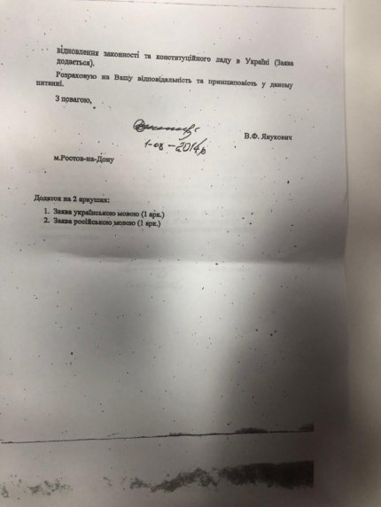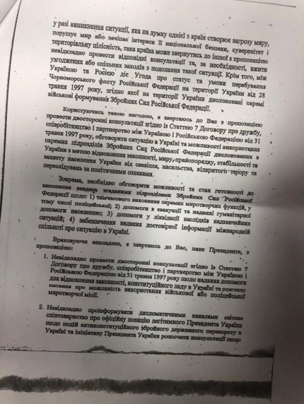Крім того, Янукович у документі розповідає Путіну про ситуацію у Криму та на Донбасі. За його словами, в Україні відбувся розкол суспільства.