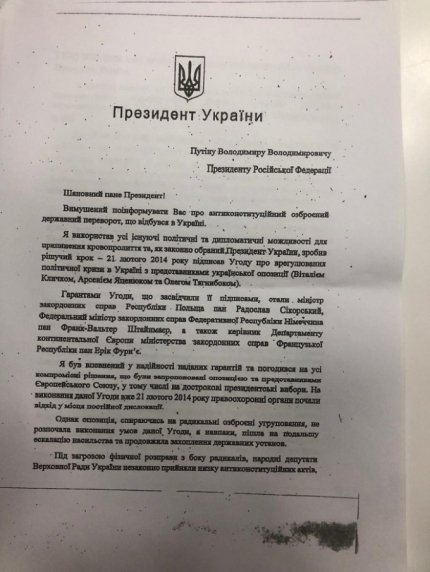 В зверненні до президента РФ Володимира Путіна Віктор Янукович просить за допомогою російських збройних сил навести лад в Україні. Він написав про "антиконституційний озброєний державний переворот", розкол в українському суспільстві тощо.