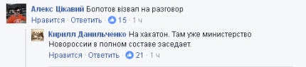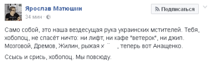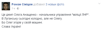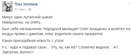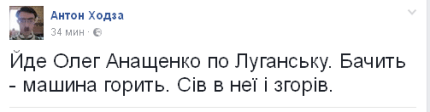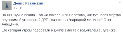 "Падіж худоби триває. Начальник управління "Народної міліції" бойовиків ЛНР полковник Олег Анащенко загинув при вибуху автомобіля в Луганську. Укродрг не відпочиває в шаббат, їздить в ліфті, працює в Москві, напуває чаєм патріотів Новоросії. Путін – спаси", — з сарказмом написав відомий український блогер Кирило Данильченко у своєму Facebook.