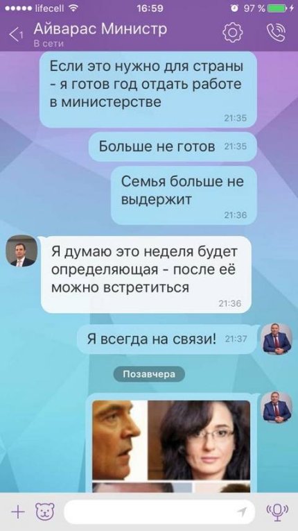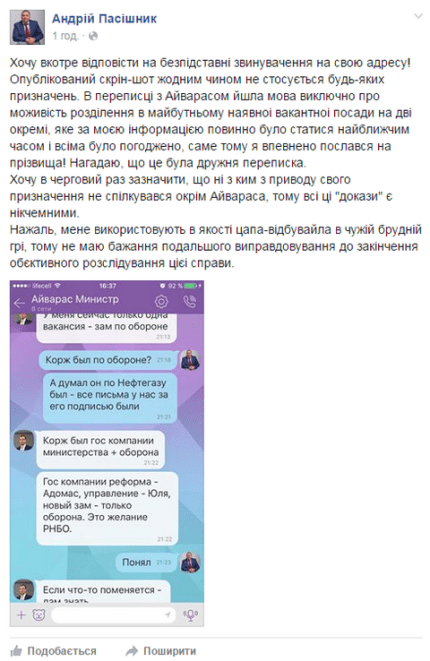 "Опублікований скріншот жодним чином не стосується будь-яких призначень. У листуванні з Айварасом йшлося виключно про можливість поділу в майбутньому наявної вакантної посади на дві окремі, який, за моєю інформацією, повинен був статися найближчим часом і всіма був погоджений, тому я впевнено послався на прізвища", - пише він.