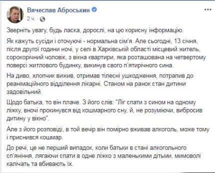 "Що стосується батька, то він плаче. За його словами:"Ліг спати з сином на одному ліжку, вночі прокинувся від кошмарного сну, і, не розуміючи, Вибросил дитини у вікно". Але з його розповіді, в той вечір він помірно вживав алкоголь, може тому і приснився кошмар", - уточнив Аброськін.