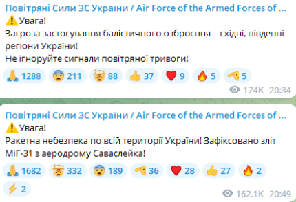 Повітряні сили ЗСУ уже озвучили попередження, що над країною зараз нависла ракетна небезпека, оскільки зафіксовано зліт винищувача МіГ-31 з аеродрому "Саваслейка" в Нижегородській області.