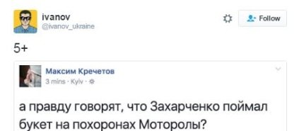"А правду кажуть, що Захарченко зловив букет на похоронах Мотороли?", - жартує блогер Максим Кречетов.