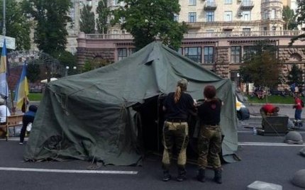 Центральна вулиця столиці перекрита для руху транспортних засобів приблизно з 11:30. На виїзді з двору Печерського районного суду протестуючі встановили намет.